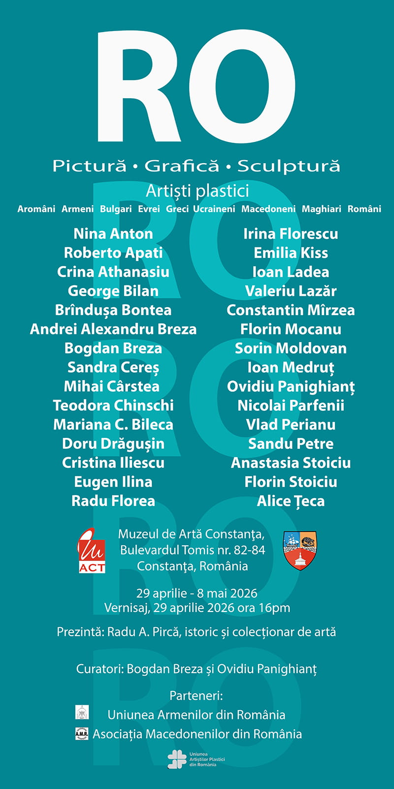 Muzeul de Artă Constanța vernisează în 29 aprilie 2026, ora 16.00, expoziția de grup a unui proiect ce are deja o adevărată tradiție: RO. Sub acest nume au fost prezentate în muzee și galerii din toată România, de-a lungul a șapte ediții ale proiectului, lucrări de pictură, grafică și sculptură ale unor plasticieni contemporani de prim rang, aparținând tuturor grupurilor etnice. Avem astfel la Constanța artiști maghiari, armeni, macedoneni, evrei, italieni, germani, aromâni, greci, bulgari, cehi și, desigur, români. Formulele și combinațiile variază însă de la un eveniment la altul, ca un adevărat caleidoscop etnic.
